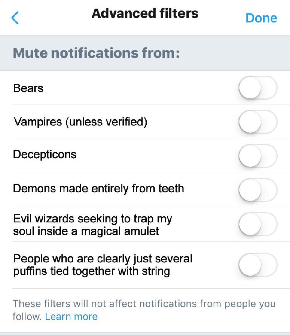 RT @ArenaFlowers : Did You Know? In advanced filters, you can mute Twitter notifications from a variety of sources.